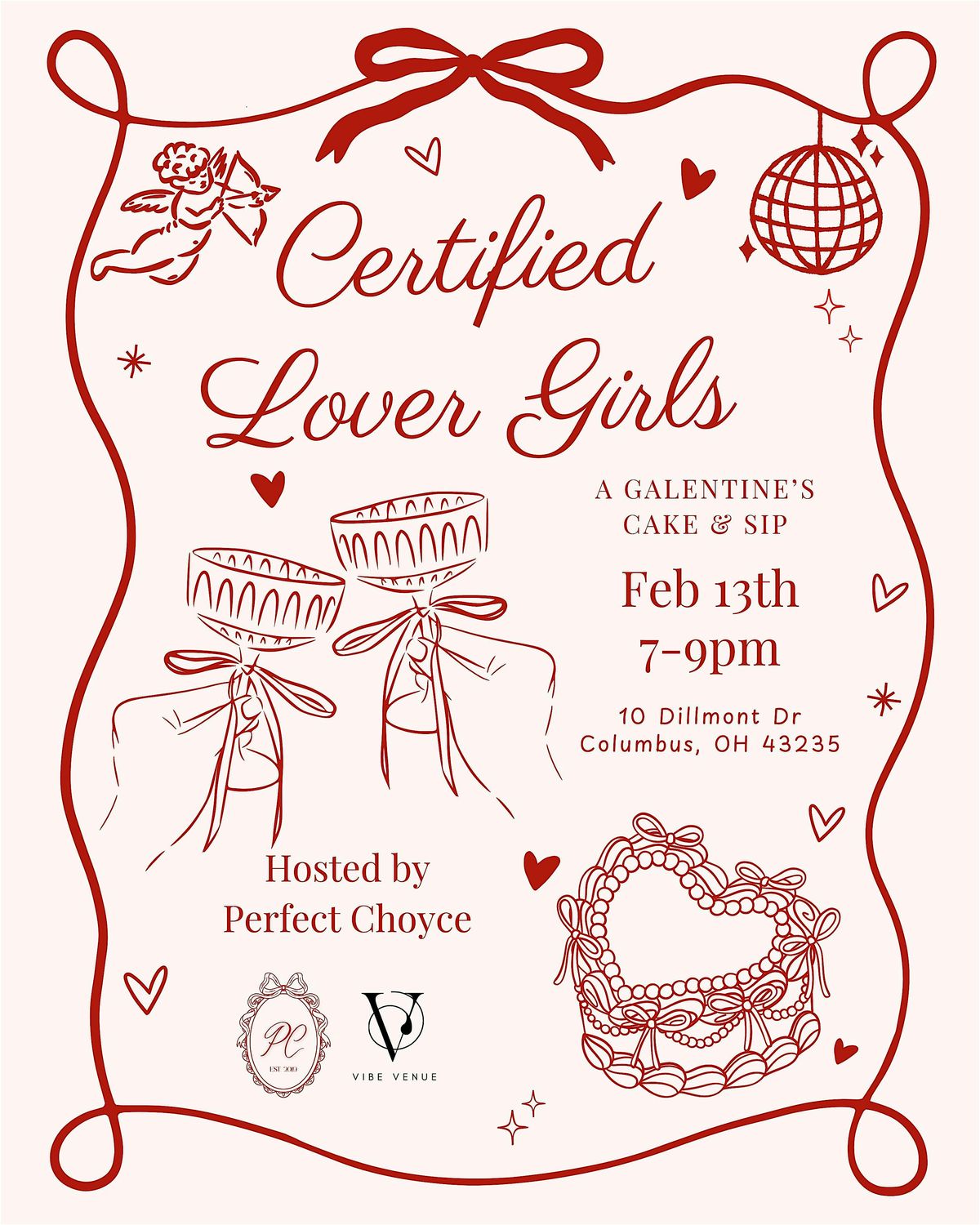 Certified Lover Girls: A Galentine’s Cake & Sip is a fun, elevated girls’ night designed to celebrate friendship, love, and creativity. Guests will enjoy a hands-on cake decorating experience led by Perfect Choyce, with all supplies included — cakes, tools, and guidance provided.