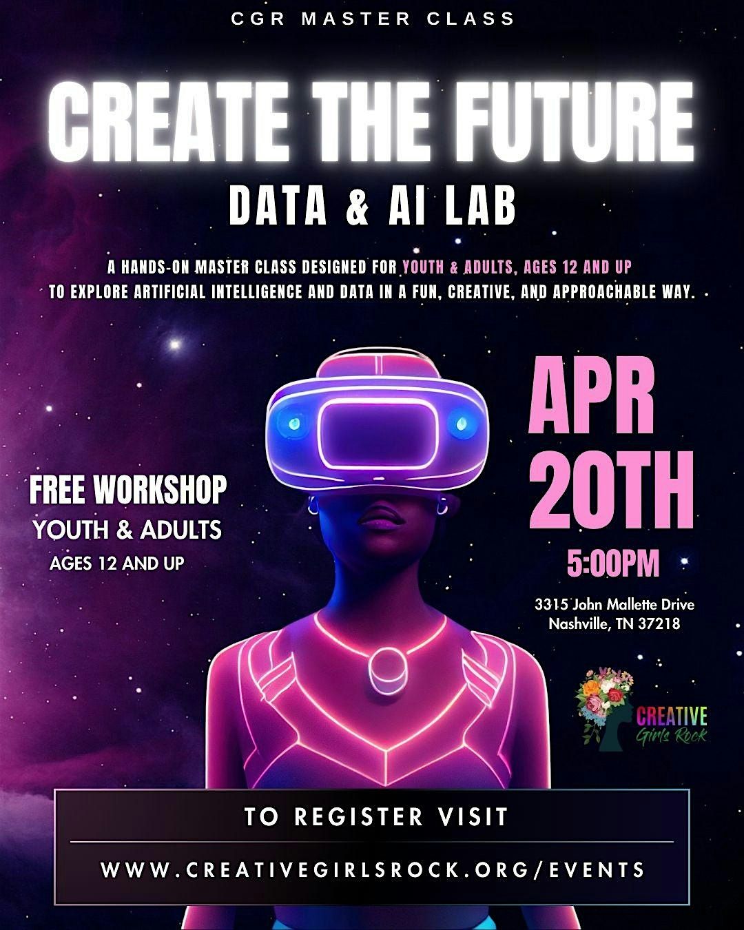 Create the Future: AI & Data Lab is a hands-on master class designed for youth and adults, ages 12 and up to explore artificial intelligence and data in a fun, creative, and approachable way.