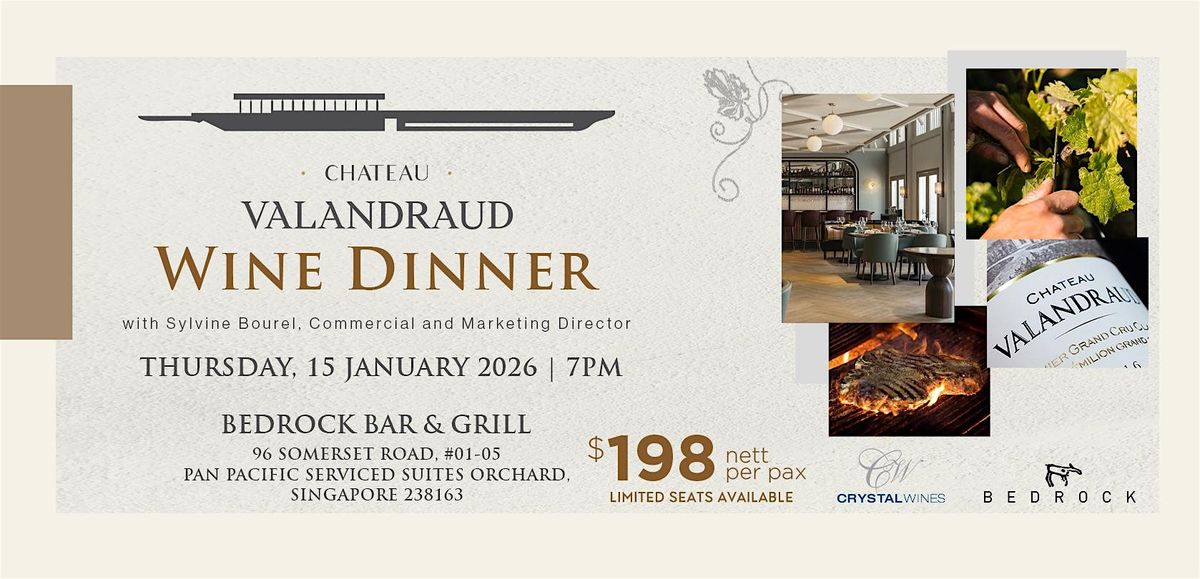 Join us for an exclusive wine dinner featuring Chateau Valandraud, one of Saint-Emilion’s most celebrated modern icons. Hosted by Sylvine Bourel, Commercial and Marketing Director, this intimate evening pairs Valandraud’s precision-driven, terroir-focused wines with Bedrock’s refined cuisine. A rare opportunity to explore Grand Cru craftsmanship in the company of the estate’s leadership.