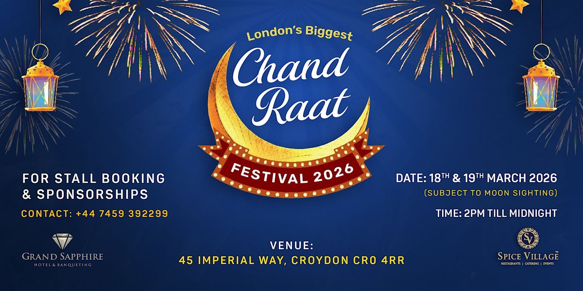 Join us in person to celebrate the magic of Chaand Raat. Experience the festive vibes, colorful lights, and delicious treats as everyone gathers to welcome Eid with joy and excitement. Don't miss out on the fun, laughter, and unforgettable moments. Let's make Chaand Raat 2026 a night to remember!