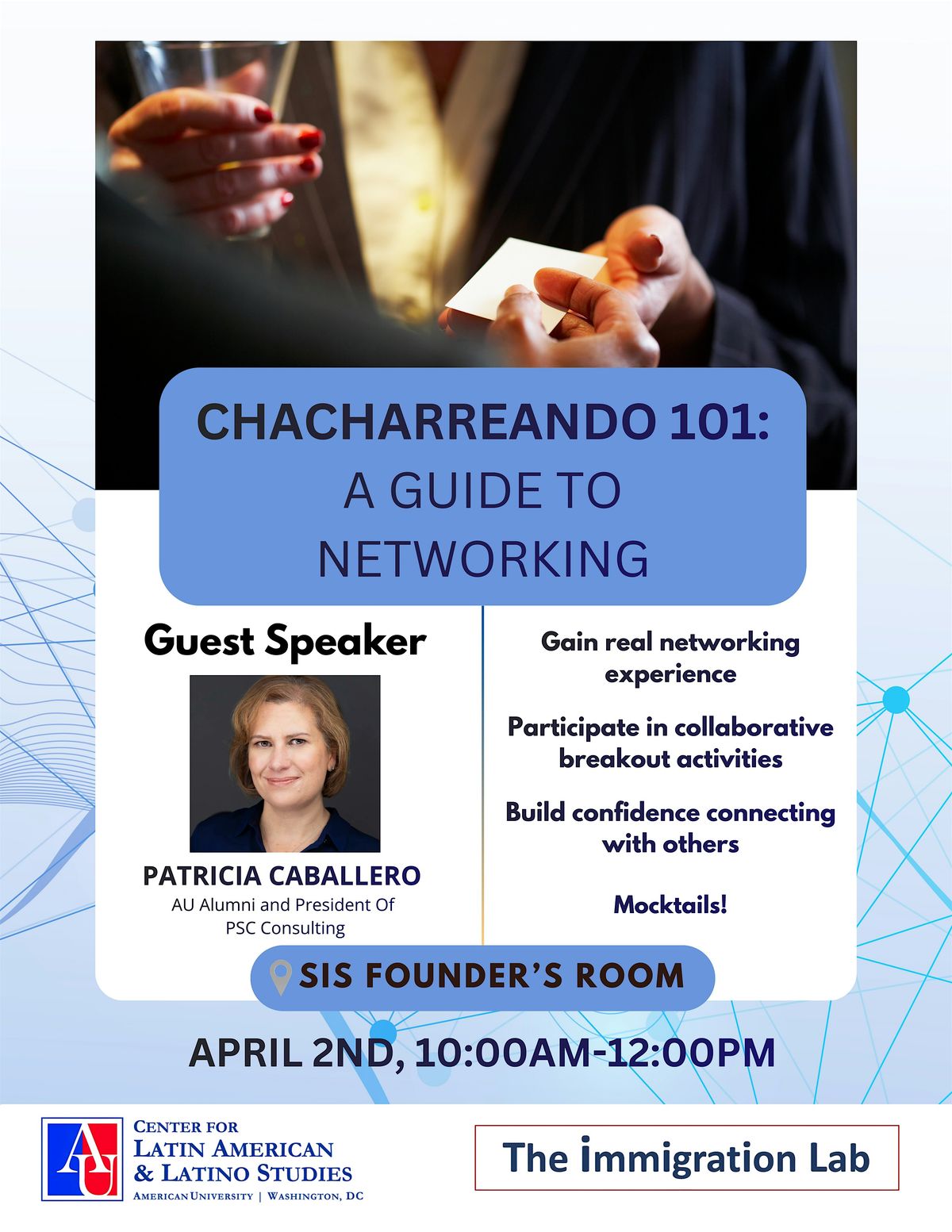 If you're ready to turn small talk into big connections, join us for "Chacharreando 101: A Guide for Networking" on Thursday, April 2nd in the SIS Building Founder's Room from 10:00 AM to 12:00 PM.