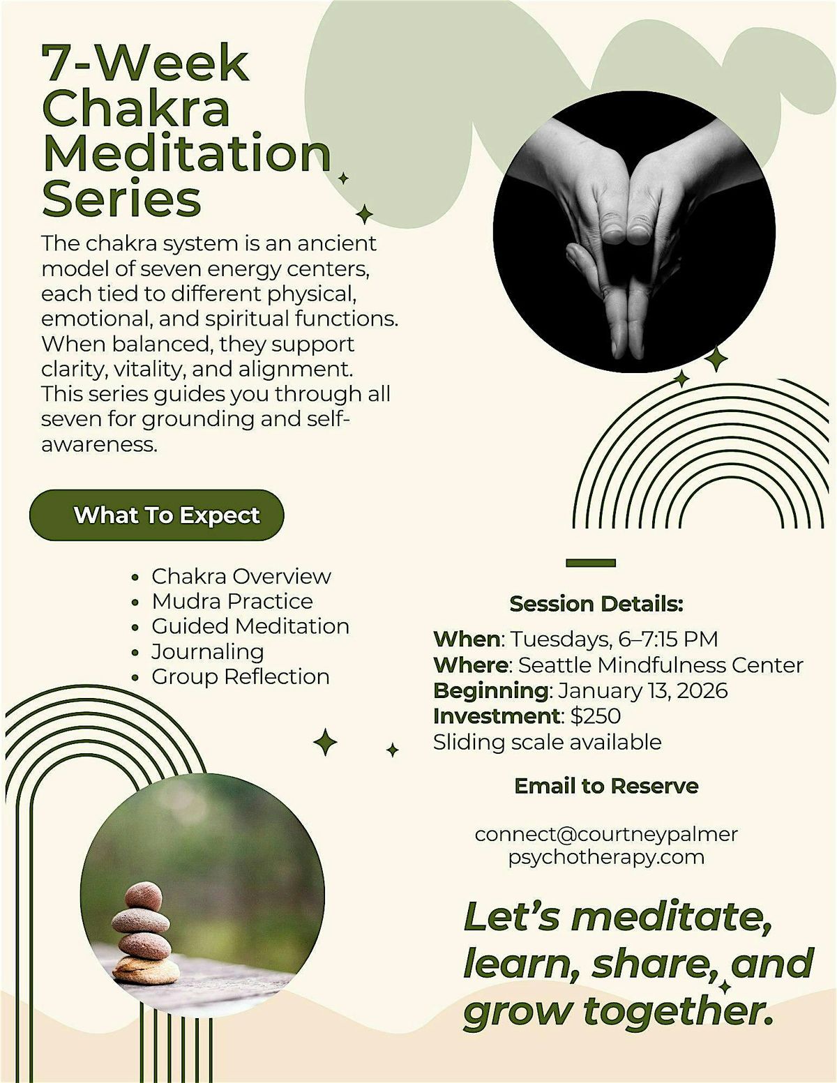 Ready to dive deep into your energy flow? Our in-person Chakra Meditation Series is the perfect way to relax, recharge, and balance your vibes. Whether you’re new to meditation or a seasoned pro, this series will guide you through unlocking your chakras for better mindfulness and inner peace. Come hang out, breathe easy, and feel amazing with a group of like-minded folks. Don’t miss out on this chill, rejuvenating series.