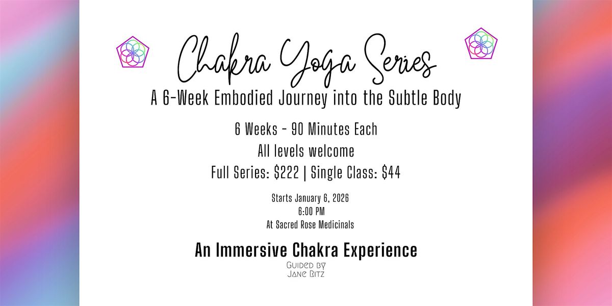 This six-week Chakra Yoga Series is an immersive journey into the subtle body—where ancient wisdom meets lived, embodied experience. In the serene space of Sacred Rose Medicinals, each week, we will explore one of the primary energy centers (chakras) through a holistic yoga lens, weaving together movement, breath, meditation, and conscious awareness.