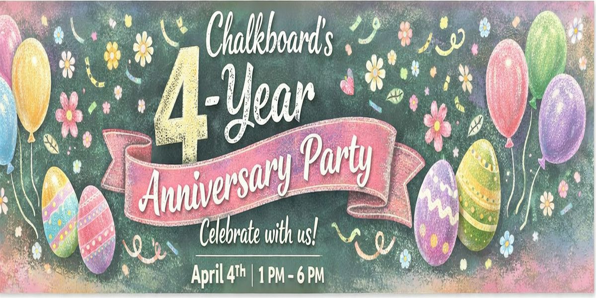 Join us for Chalkboard’s 4-Year Anniversary Party on Saturday, April 4th from 1 PM to 6 PM! Come celebrate with us for an afternoon of great food, drinks, live music, family fun, and community.
