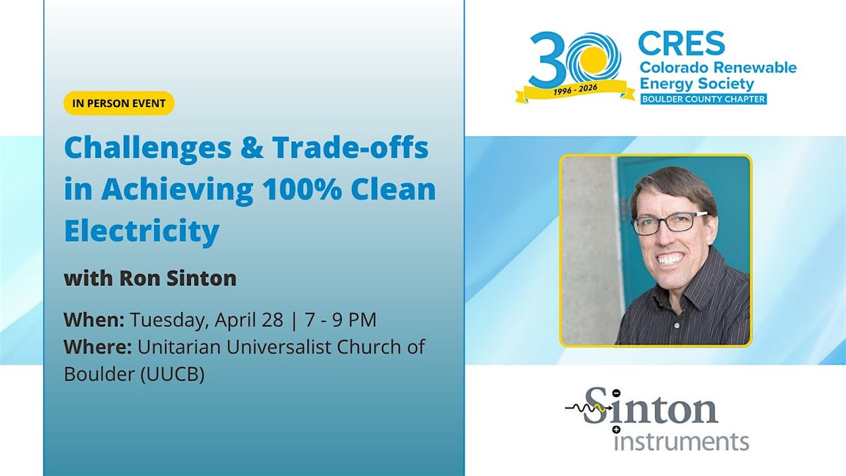 Our Boulder County chapter welcomes Ron Sinton, President of Sinton Instruments, for a Speaker Series presentation exploring the challenges and trade-offs of achieving 100% renewable energy.