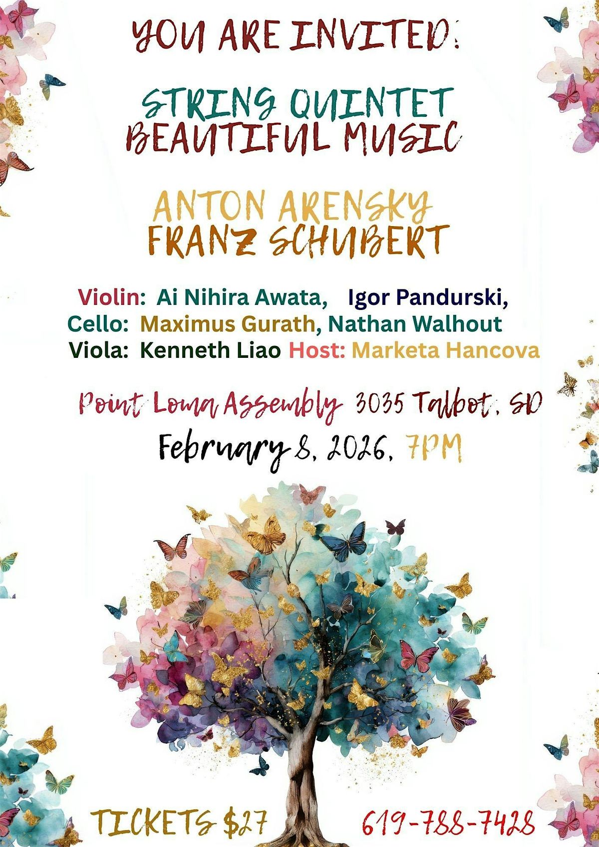 You will be in good hands with our dynamic passionate host and especially our talented musicians: Ai Nihira Awata (Cleveland Institute of Music, Yale University), Igor Pandurski (Zagreb Music Academy, Rice University), Kenneth Liao (USC, Julliard), Nathan Walhout (Rice, Michigan University School of Music), Maximus Gurath (Rice University). All of these wonderful musicians will bring chamber music alive just for you with their unique interpretation and virtuosic performance.