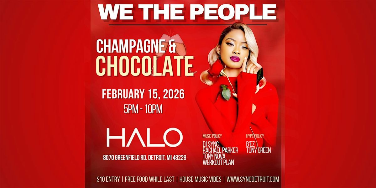 Champagne & Chocolate: Feb 15, 5–10pm at Halo Detroit. House vibes with Rachael Parker, Tony Nova, Werkout Plan & DJ Sync. Dress up & dance.