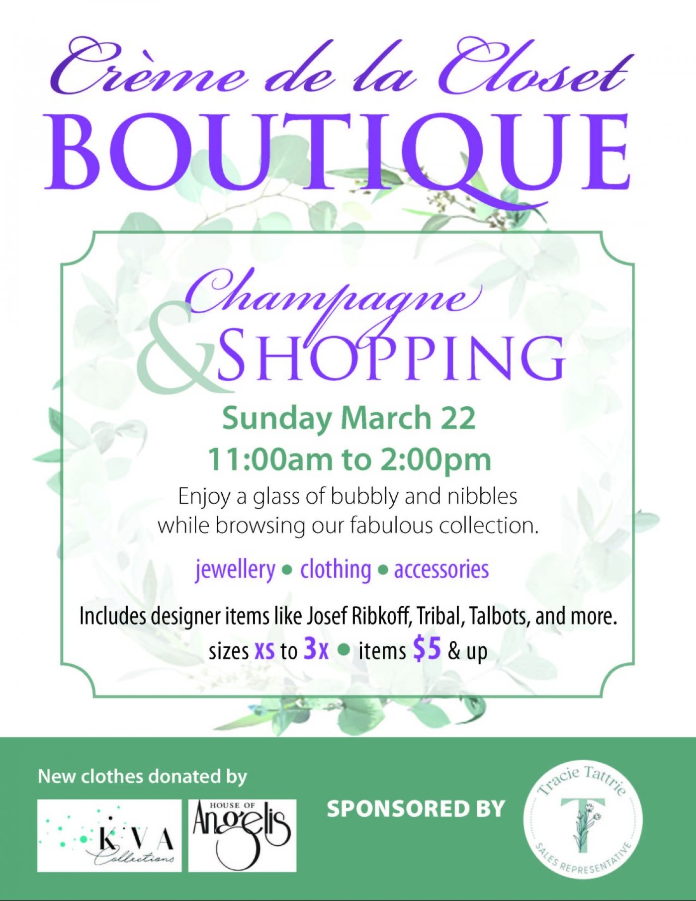 Enjoy some bubbly & nibbles while browsing our fabulous collection of gently used women's clothing, jewellery, and accessories. Also includes new clothing donated by KVA Collections and House of Angelis. Brands include Josef Ribkoff, Simpli, J.Cew & Talbots. Sizes Xs to 3x. Items are $5 & up. Free admission.