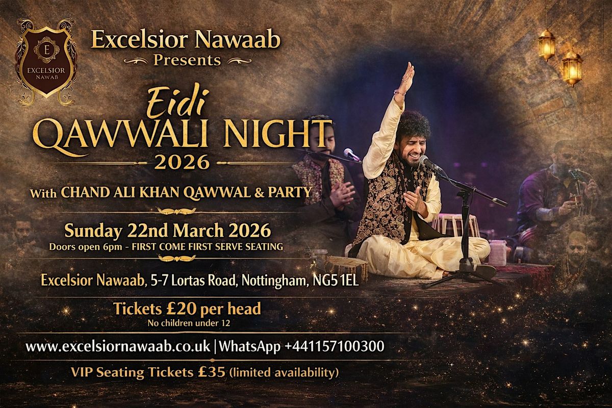 Celebrate the spirit of Eid with an unforgettable evening of soulful Qawwali at Excelsior Nawaab in Nottingham. Join us for Eidi Qawwali Night 2026, featuring the renowned Chand Ali Khan Qawwal & Party, delivering powerful live performances filled with passion, rhythm, and traditional Sufi music.