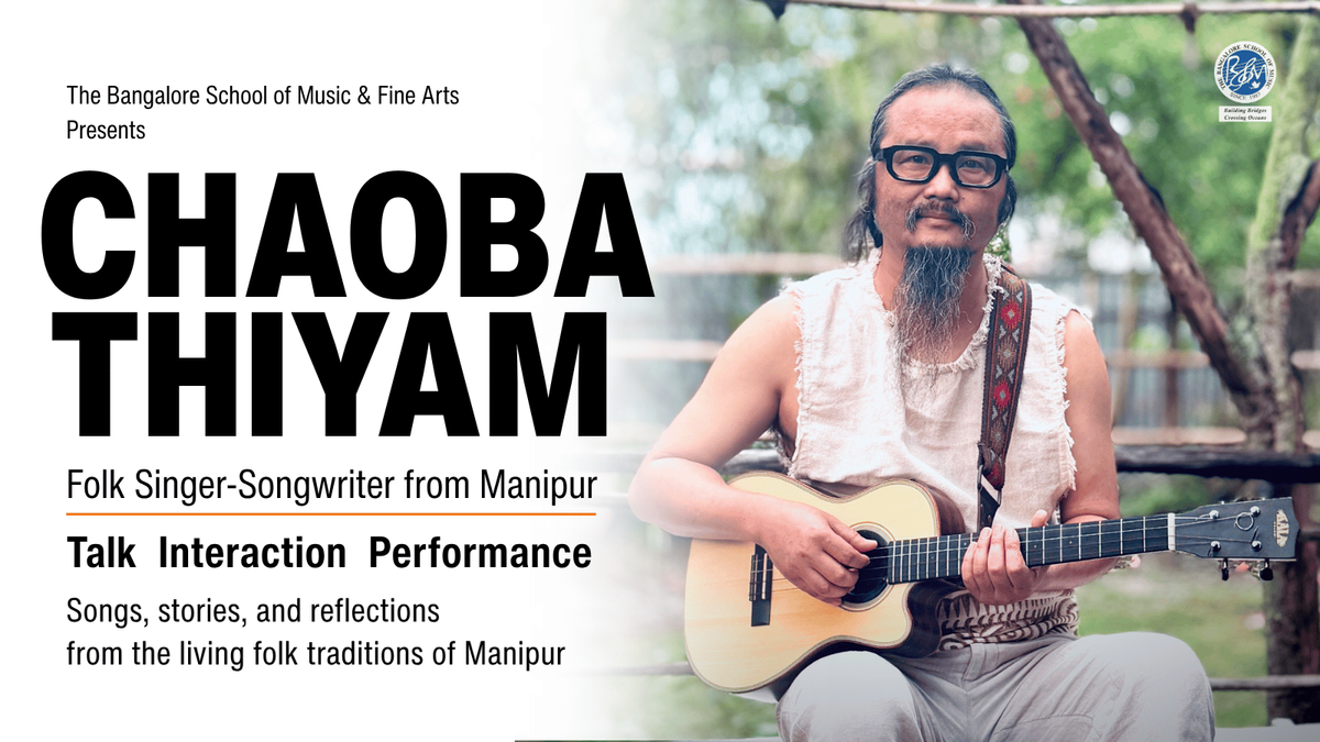 Chaoba Thiyam is a folk singer-songwriter, sound artist from Manipur, Northeast India. He is the creative director of SIYOM, an art space and heads a folk-based band under the same name dedicated to exploring sound, story, and community.Rooted in the tradition of Pena storytelling and the rich folk heritage of Manipur, hissongs and music reimagine folk narratives through contemporary expression breathing a new life into ancient poetry and folk wisdom.His works transcend language and age, inviting listeners into reflections on truth, ecological consciousness, cultural memory, ancient wisdom and artistic freedom.