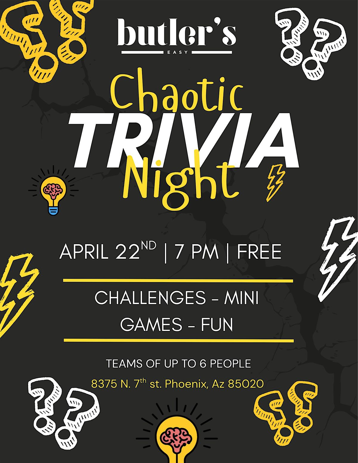 Trivia night, but make it chaotic. Join us at Butler’s Easy for a high-energy night full of random questions, mini games, and unpredictable challenges. Bring a team (up to 6 people) and get ready to battle for glory — it’s totally free!