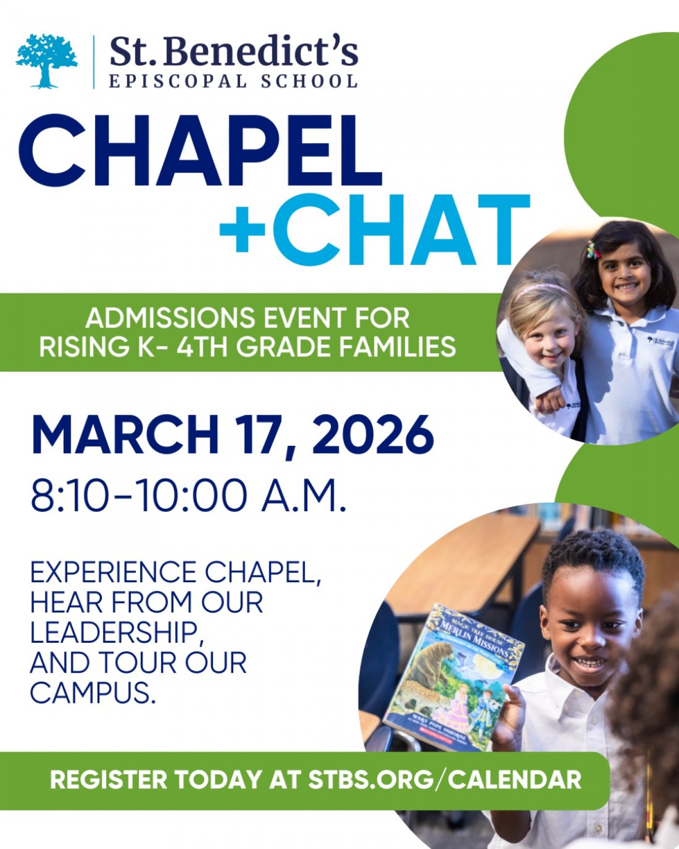 As you consider what St. Benedict’s has to offer, we invite prospective families of rising Kindergarten through 4th Grade students to join us for Chapel + Chat. Guests will attend chapel, hear from school leadership, and tour our vibrant campus to see how St. B’s fosters both growth and belonging during the early years of school.
