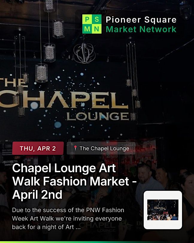 Vendors sign up here: https://pioneersquaremarket.net/events/chapel-lounge-march-art-walk-event-at-the-chapel-lounge-20260402-1700