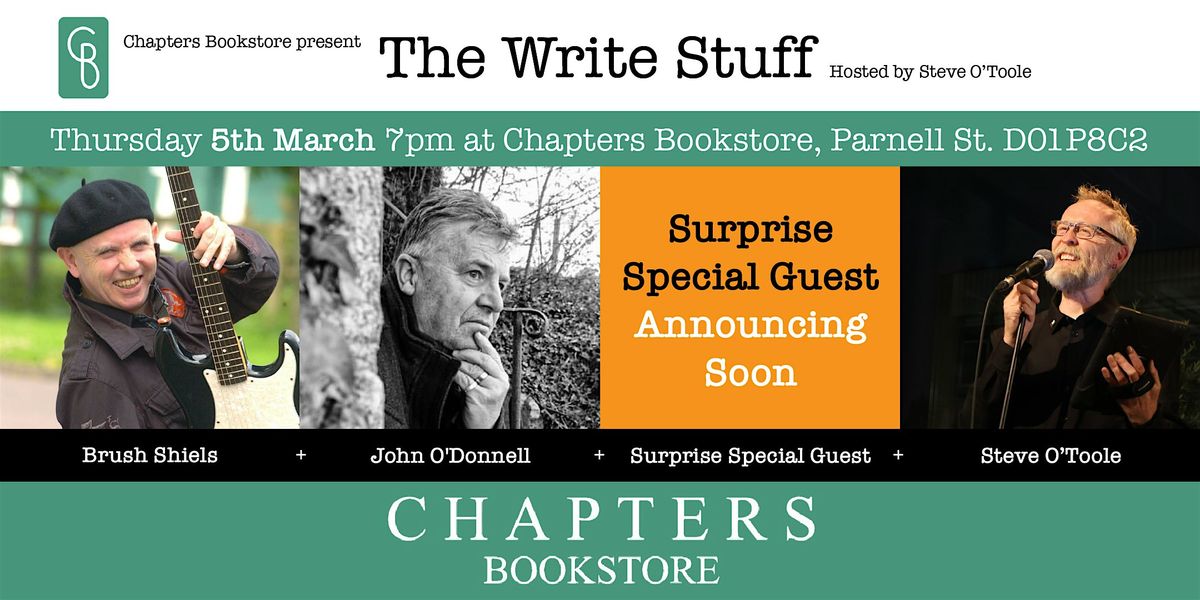 Chapters Bookstore presents an evening of Poetry Songs and laughter hosted by Steve O'Toole featuring Brush Shiels, John O'Donnell and a special surprise guest to be announced Feb 22nd. Tickets are €5 each, a €5 gift voucher for Chapters Bookstore is included in the price of your ticket
