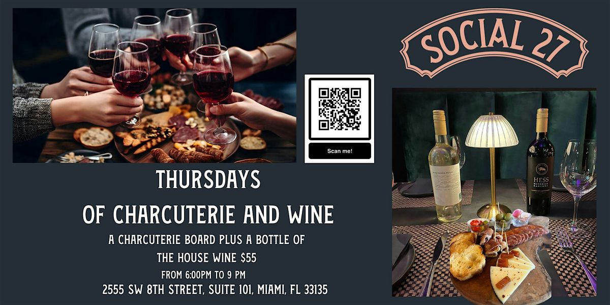 event! Join us on Thursdays at Social 27 Miami for a night of delicious food and wine pairings. Indulge in a variety of meats, cheeses, fruits, and more on our beautifully curated charcuterie boards while sipping on a selection of fine wines. Whether you're a wine connoisseur or just looking for a fun night out with friends, this event is perfect for everyone. Don't miss out on this opportunity to enjoy the great atmosphere and tasty food and drinks. See you there!