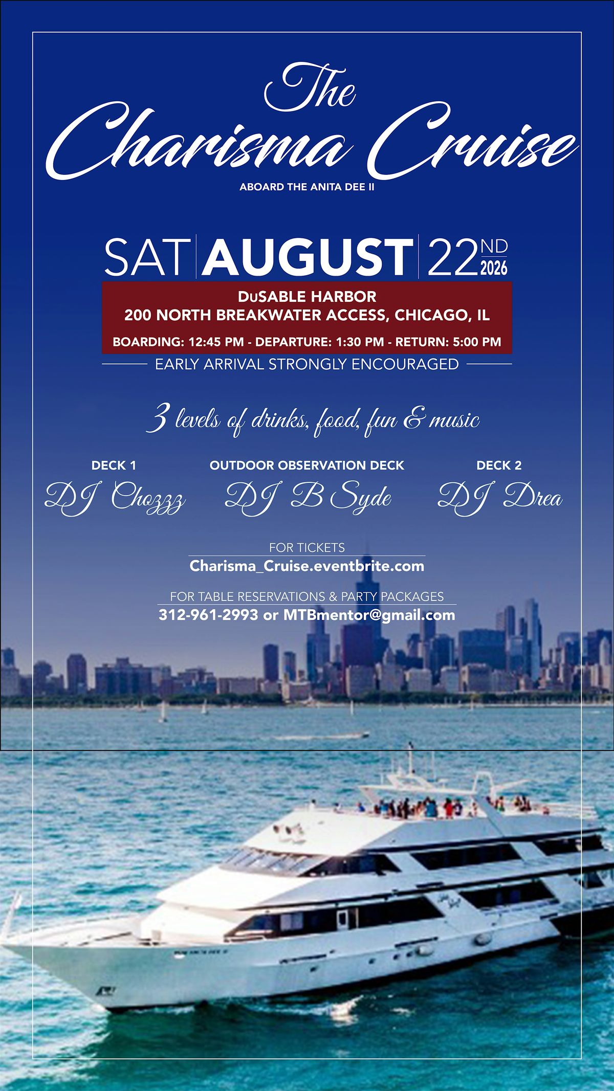 Join us for a fun and relaxing cruise at Pinnacle Yachts - DuSable Harbor! Mark your calendar for August 22, 2026 at 12:30 PM (Central Time). Featuring 3 decks of non-stop music by Chicago DJs: DJ Chozzz, DJ Dreea and Ft. DJ B Syde on the upper Deck. Chicago house, Hip-Hop, RnB, Reggae, Steppers and more. It’s the perfect way to enjoy the summer vibes, meet new people, and soak in the beautiful views. Don’t miss out on this spectacular in-person event — see you on deck!