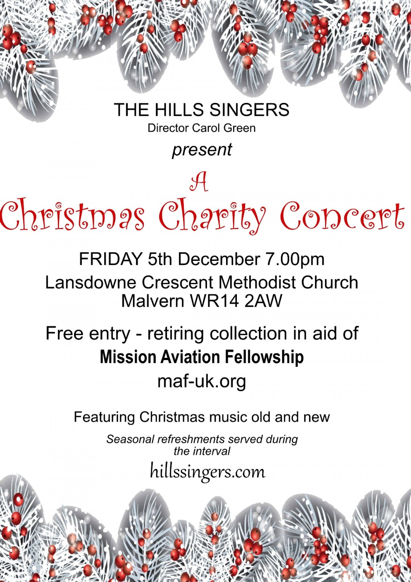 A free Christmas concert with music old and new sung by the Hills Singers in Lansdowne Crescent Methodist Church. There will be a retiring collection in aid of Mission Aviation Fellowship www.maf-uk.org and there will be seasonal refreshments served during the interval. It's on a Friday evening 5th December at 7pm so an ideal time to get into the run up to Christmas. Carol and the gang look forward to welcoming you there!