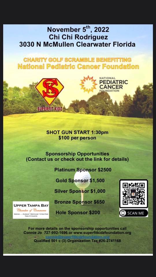 Please join us November 5th 1:30 PM Scramble. $100/person includes food and alcohol. Sponsorships still available. Call Connie Jo 727-992-1696. Www.SuperFitkidzfoundation.org to register