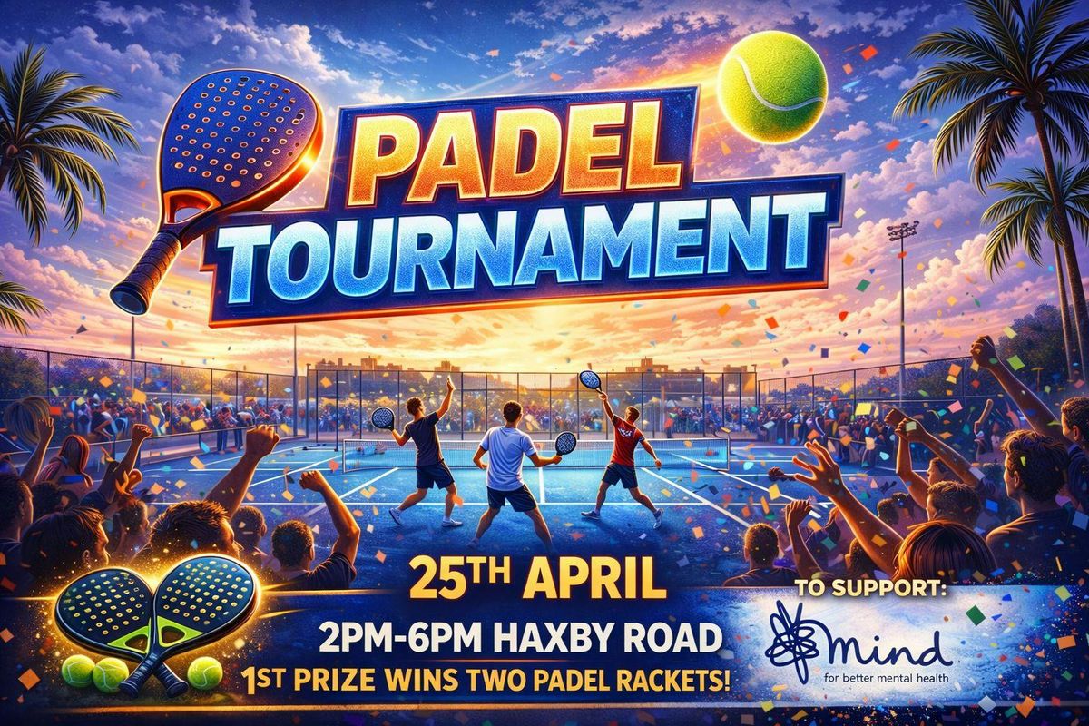 We'd love everyone to spread the word about our charity padel tournament in support of Mind York!Winners will receive TWO FREE padel rackets Huge raffle with prizes including Morrisons vouchers, David Lloyd memberships + more