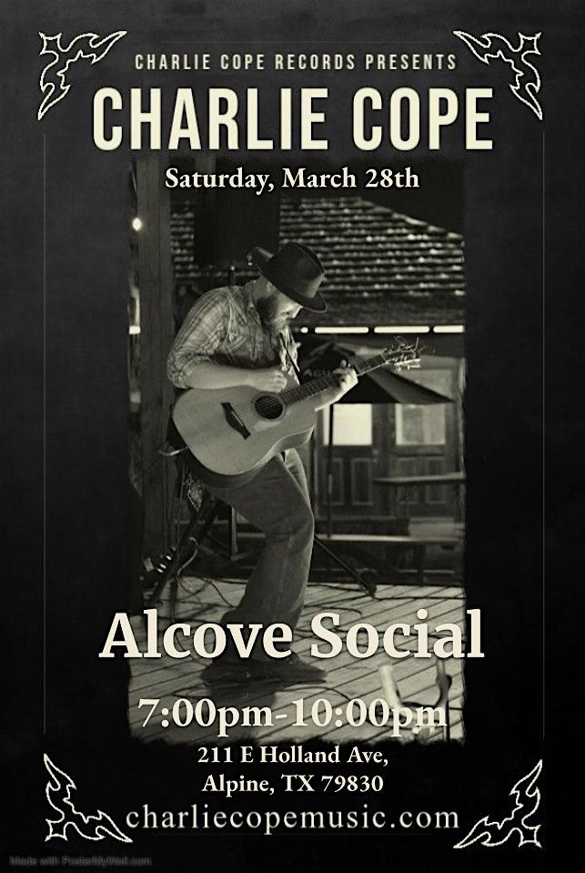 Live music that fits the room. Charlie Cope brings an intimate acoustic show to Alcove Social in Alpine on March 28, blending original songs with stories that pull you in and don’t let go.