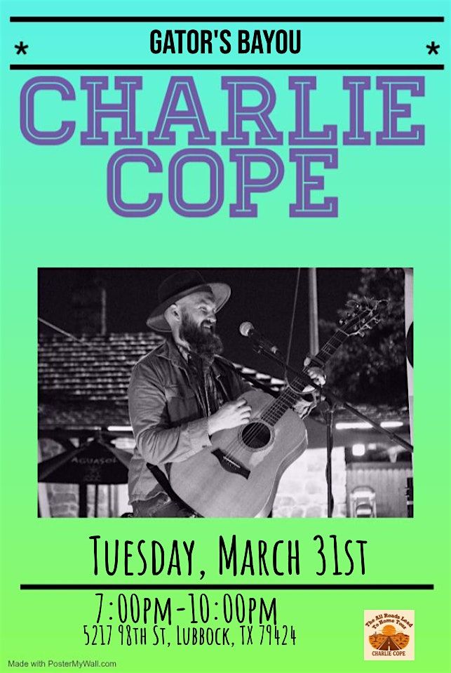 An evening of original music and honest storytelling. Charlie Cope performs live at Gator's Bayou in Lubbock on March 31 for a show designed to meet the moment.