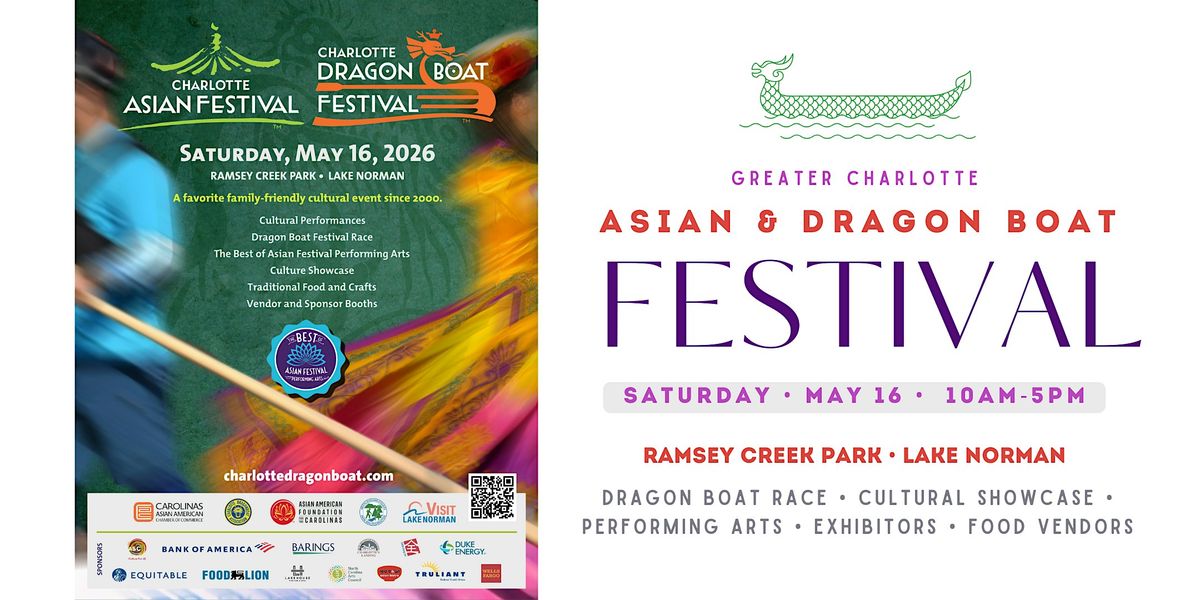 The 2026 Charlotte Asian Festival and Charlotte Dragon Boat Festival are set for Saturday, May 16 at Ramsey Creek Park on Lake Norman (Cornelius, NC). This annual family-oriented event is a celebration of Asian cultures. We welcome the Asian and non-Asian community in and around Mecklenburg County and throughout the Carolinas. The festival celebrates Asian cultures, diversity, ethnicity, roots and history.