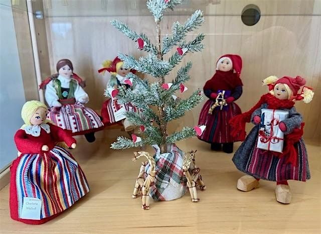 Gammelgården Museum has one of the largest collections of Charlotte Weibull dolls in the United States, with over 150 dolls. The images of the dolls, with a line to the location in Sweden, show where the folk dräkt would be worn.