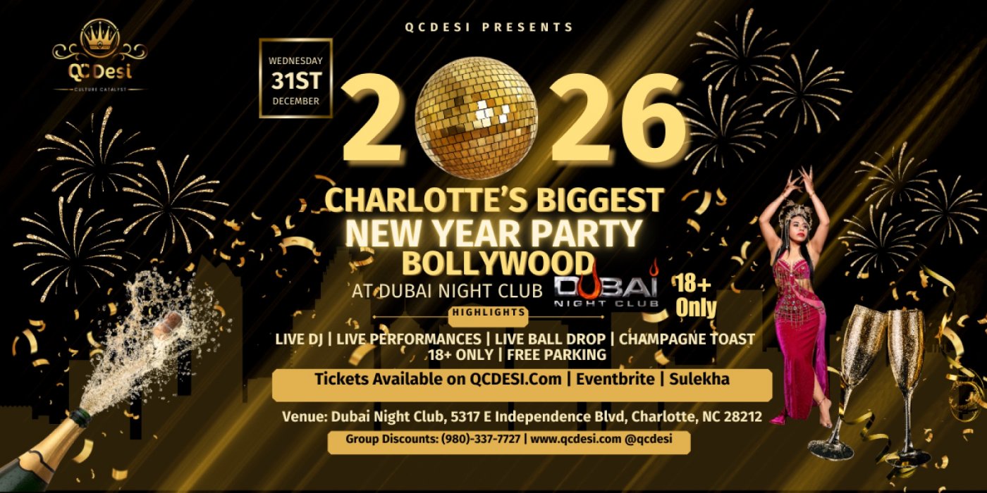 Ring in 2026 at Charlotte’s Biggest Desi New Year Eve Party, brought to you by QCDesi—the city’s leading Desi entertainment group! This year, we’re taking the celebration to Dubai Night Club, one of Charlotte’s top nightlife destinations, for a night packed with music, culture, and high-energy vibes.