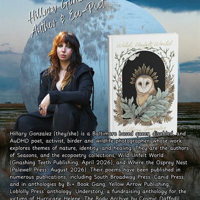 Hillary Gonzalez (they/she) is a Baltimore based queer, disabled, and AuDHD poet, activist, birder and wildlife photographer, whose work explores themes of nature, identity, and healing. They are the authors of Seasons, and the ecopoetry collections, Wild Unfelt World (Gnashing Teeth Publishing, April 2026), and Where the Osprey Nest (Palewell Press, August 2026). Their poems have been published in numerous publications, including South Broadway Press, Canid Press, and in anthologies by Bi+ Book Gang, Yellow Arrow Publishing, Loblolly Press’ anthology: Understory, a fundraising anthology for the victims of Hurricane Helene, The Body Archive by Cosmic Daffodil Journal, and In Praise of Despair, an anthology for disabled artists and writers by Beyond the Veil Press.