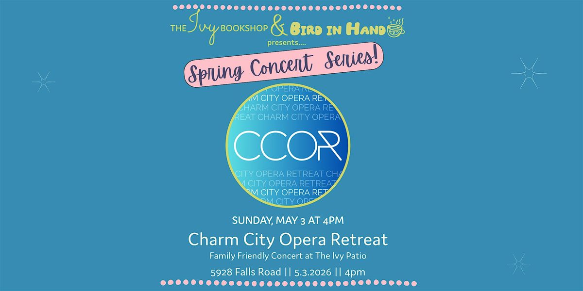 Artists from Charm City Opera Retreat present a lively, family friendly performance at The Ivy Bookshop. This special event highlights early career singers from Baltimore sharing vibrant selections from opera and musical theater. Dedicated to empowering singers through professional development opportunities and community building, Charm City Opera Retreat offers audiences a chance to experience the power and beauty of singing up close.