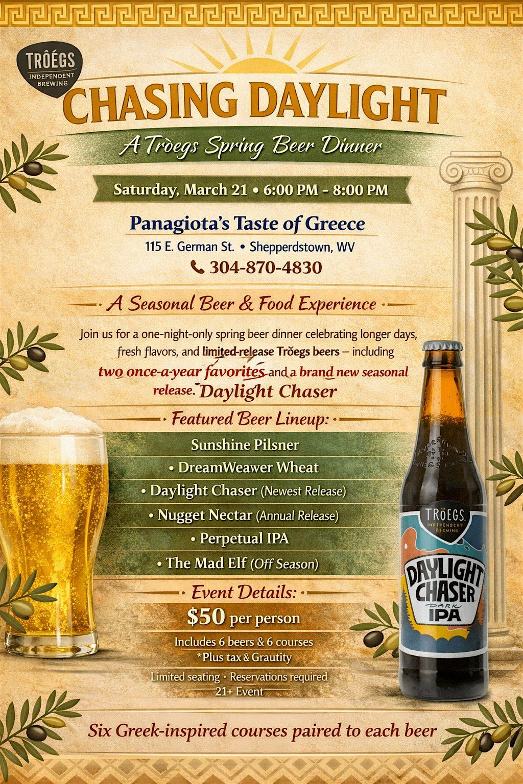 Join us for Chasing Daylight, a one-night-only spring beer dinner celebrating longer days, fresh flavors, and a curated lineup of Tröegs Independent Brewing favorites.