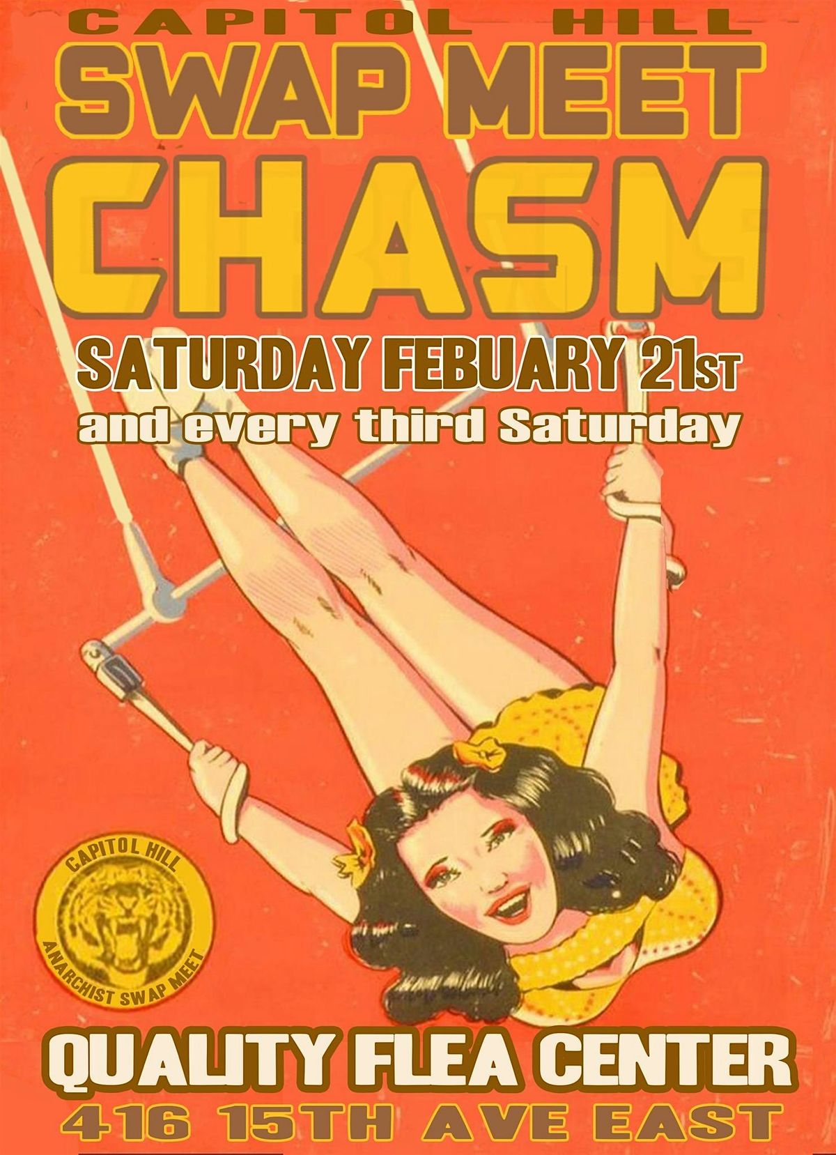 CHASM, the Capitol Swap Meet is coming up on Saturday 2/21 and every third Saturday forever! At the Quality Flea Center, 416 15th Ave. E. Best little swap meet on Capitol Hill!