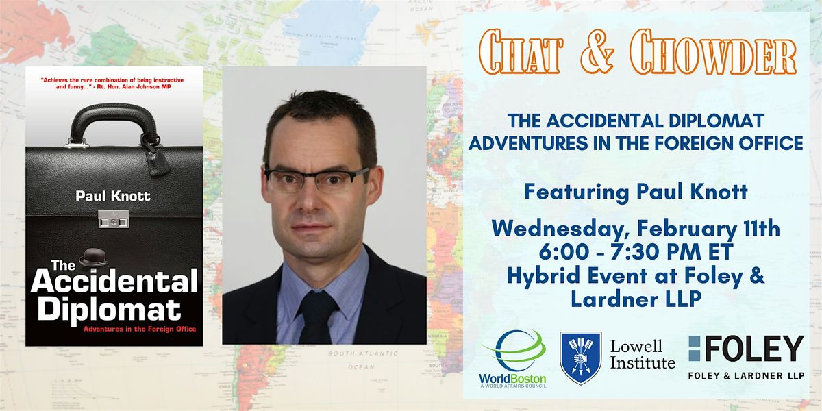 Join us for this installment of our popular Chat & Chowder series, featuring former British Foreign Service Officer, Paul Knott. Mr. Knott will discuss his improbable career and tell us many of his exciting stories from his time in the Foreign Service, from being posted in post-revolutionary Romania, to being abducted by hospitality terrorists in Dubai, to meeting his wife in the then police-state of Uzbekistan, along with many more fascinating stories and insights. Whether you are an avid watcher of international news or interested in becoming a diplomat yourself, this event is for you!
