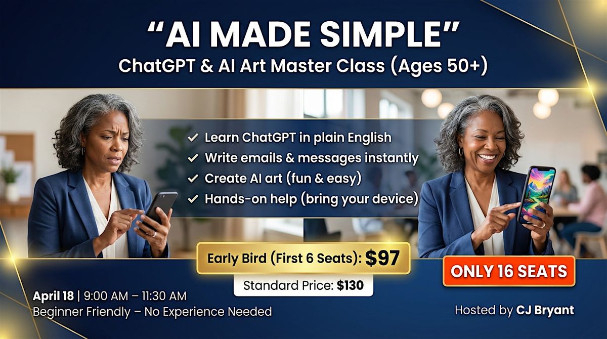 Learn AI in One Day on April 18th! Join us for a fun, hands-on in-person workshop designed just for adults 50 and up. Whether you're curious about ChatGPT or want to get comfortable with AI tools, this event is perfect for beginners. Come hang out, ask questions, and discover how AI can make life easier and more exciting. Don’t miss out on this chance to boost your tech skills and meet new friends!