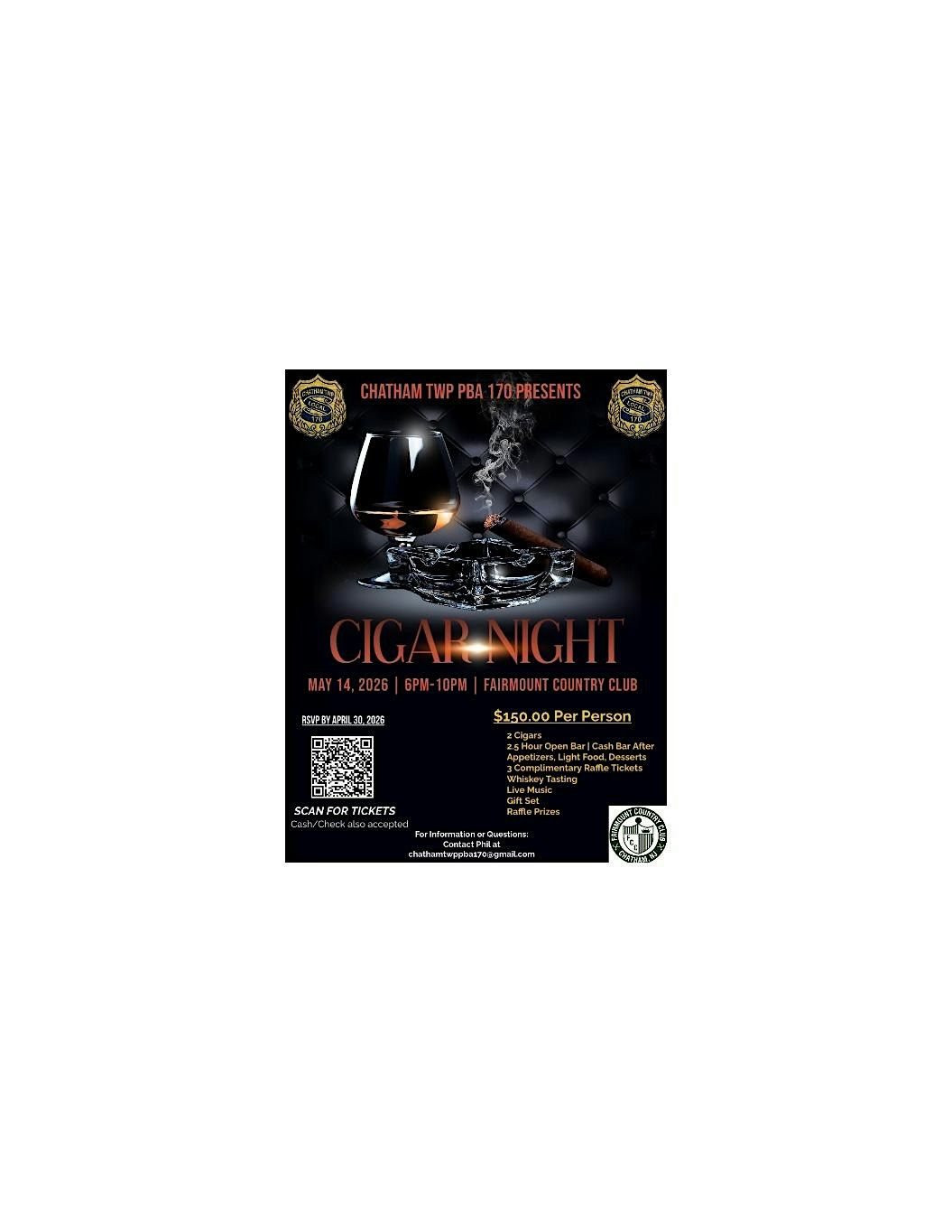 The members of the Chatham Township PBA 170 are proud to announce our Inaugural Cigar Night, taking place on May 14, 2026 at the exclusive, Fairmount Country Club. This exciting new event will bring together members, supporters, and community friends for an evening of good food and company, premium cigars, and camaraderie—all in support of our PBA, which assists with local community initiatives.