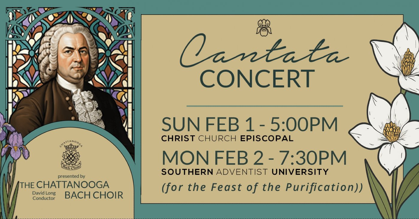 The Chattanooga Bach Choir & Orchestra, David Long artistic director and conductor continues their Bach Cantata series featuring Cantata BWV 125 Mit Fried und Freud ich fahr dahin (In peace and joy I now depart). The performance takes place twice: on Sunday, February 1 at 5 p.m. at Christ Episcopal Church, 663 Douglas Street in Chattanooga; and on Monday, February 2 at 7:30 p.m. at Southern Adventist University’s Ackerman Auditorium in Mabel Wood Hall, 5051 Harmony Lane, Collegedale. Tickets are $25; Students with ID are $5 and can be purchased at the door or in advance at: www.chattanoogabachchoir.org/.