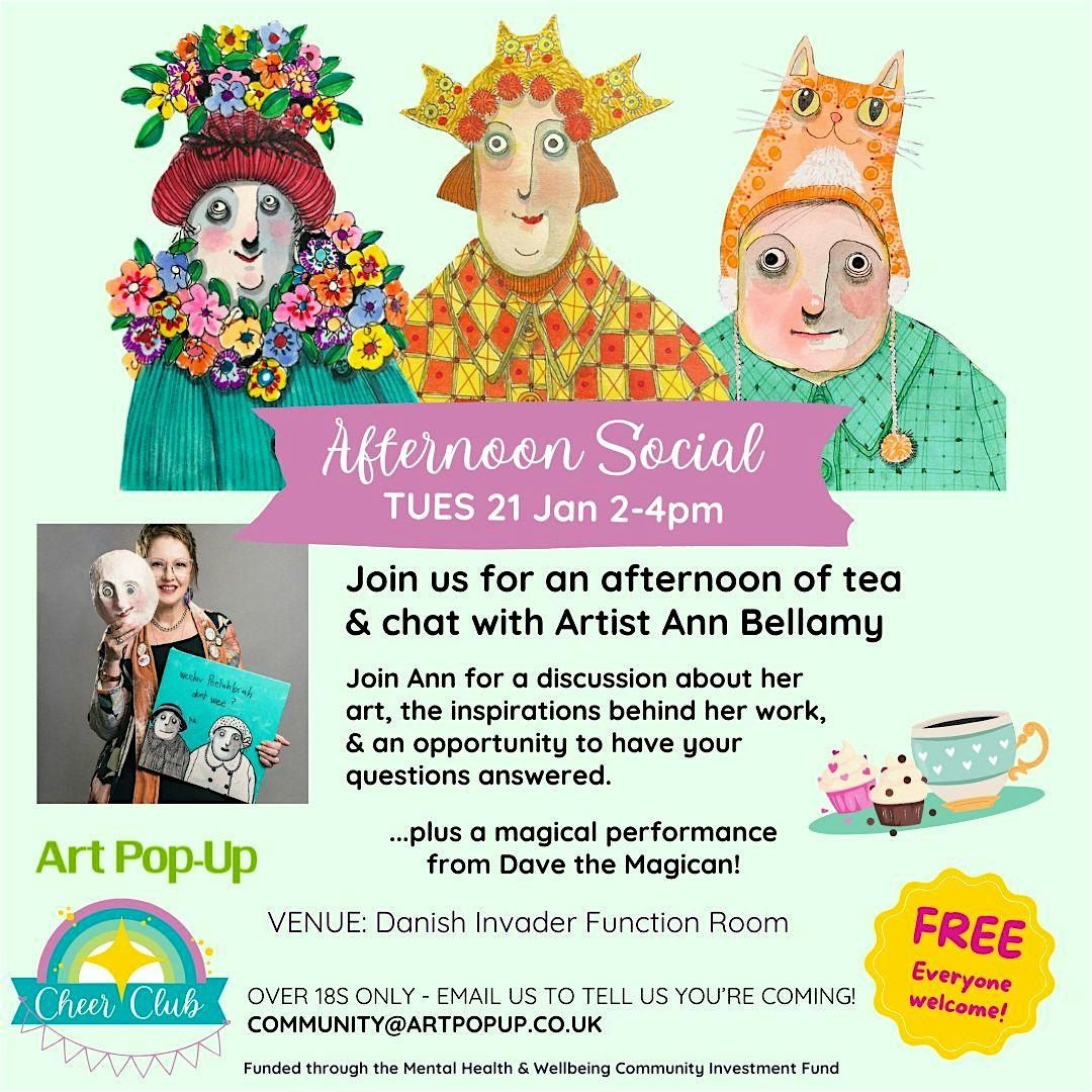 Come and spend some time with the Cheer Club at the Danish Invader Function Room from 2-4pm. The event will include a short chat with Artist Ann Bellamy about her art, the inspirations behind her creative process, and an opportunity to have your questions answered, as well as a performance from Dave the Magican! and of course a chance to enjoy tea and cake!