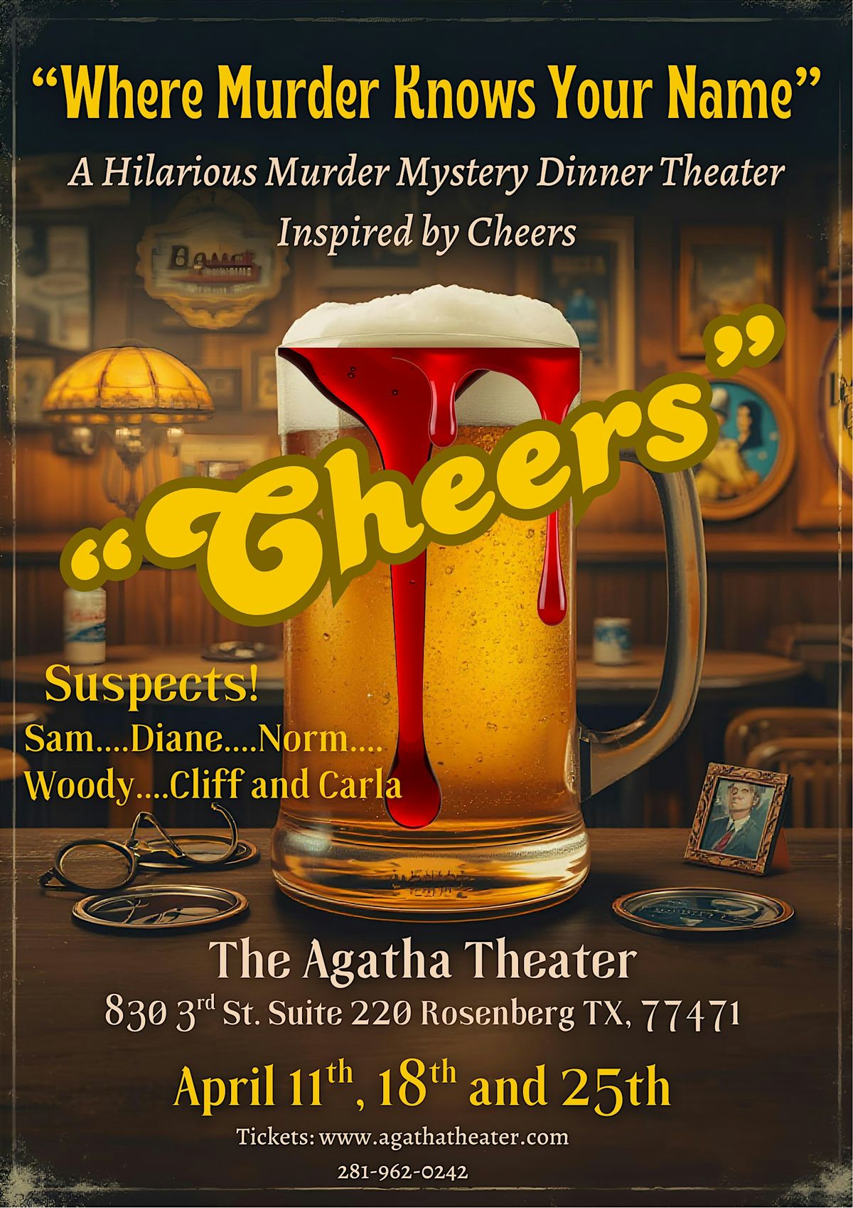 Pull up a stool and grab a cold one—there’s a killer on the loose at the neighborhood’s favorite watering hole! Join us this April for a night of nostalgia, laughs, and cold-blooded clues in our interactive M**der mystery comedy inspired by the classic sitcom Cheers. Whether you’re a regular like Norm or just stopping by for the first time, you’ll be right in the middle of the action as the "gang" tries to figure out who’s serving up more than just drinks. It’s a hilarious, high-stakes evening where everybody knows your name… but somebody might be trying to make sure you don’t leave alive.