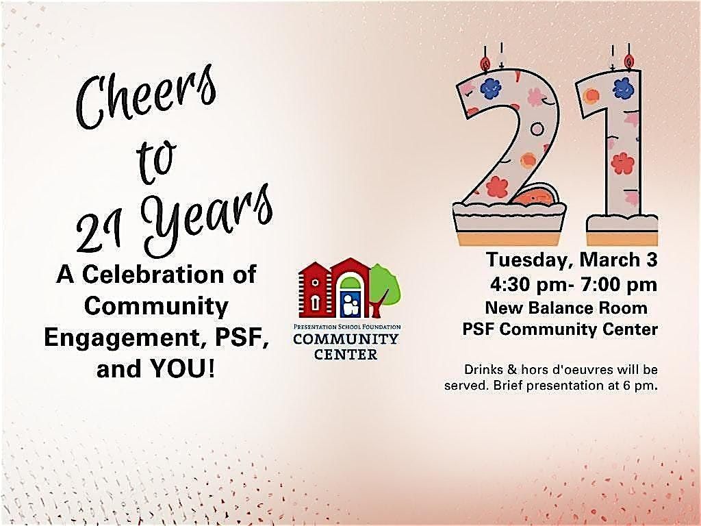 Please join the PSF Board of Directors and staff on Tuesday, March 3 in the New Balance Room at PSF Community Center from 4:30 pm- 7 pm as we celebrate our neighborhood’s efforts to create and sustain the Center as a one-of-a-kind community resource. Join fellow PSF supporters as we toast to 21 years and the amazing programs that fill our community center. Drinks and hors d'oeuvres will be served. Brief presentation at 6 pm.