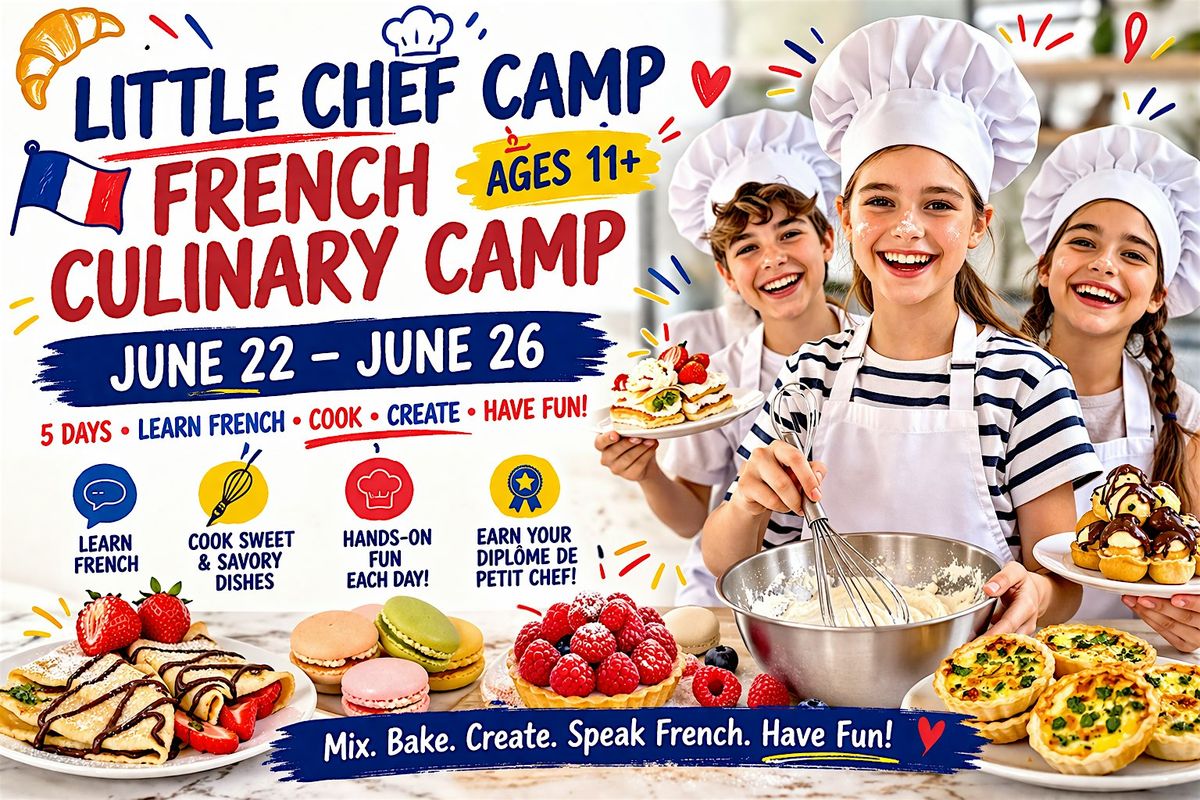 Join Chef Camille for an unforgettable week of French cooking, where teens ages 12 and up will master both sweet and savory recipes, learn real kitchen skills, and discover French language and culture all in a fun, hands-on environment!
