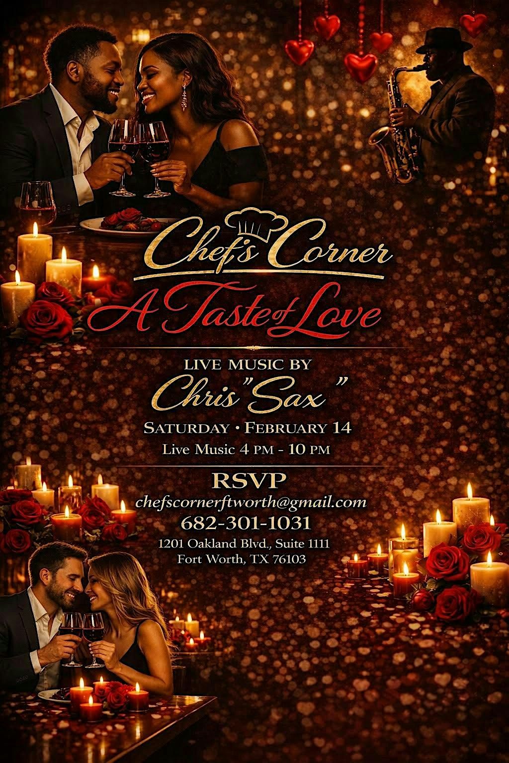 Love is in the air! Join us for a romantic Valentine's dinner at Chef's Corner. Indulge in a delightful culinary experience that will tantalize your taste buds. Don't miss this chance to savor exquisite dishes in a cozy atmosphere. live music by Chris "sax" Make sure to RSVP to secure your spot! its free to rsvp more info: call 682-301-1031
