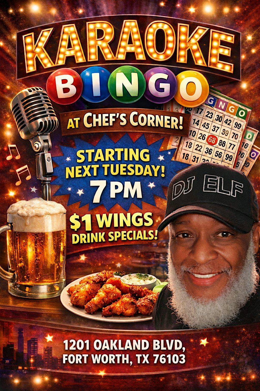 Karaoke Bingo at Chef’s Corner! Sing, win, vibe with DJ ELF—$1 wings & drink specials.
