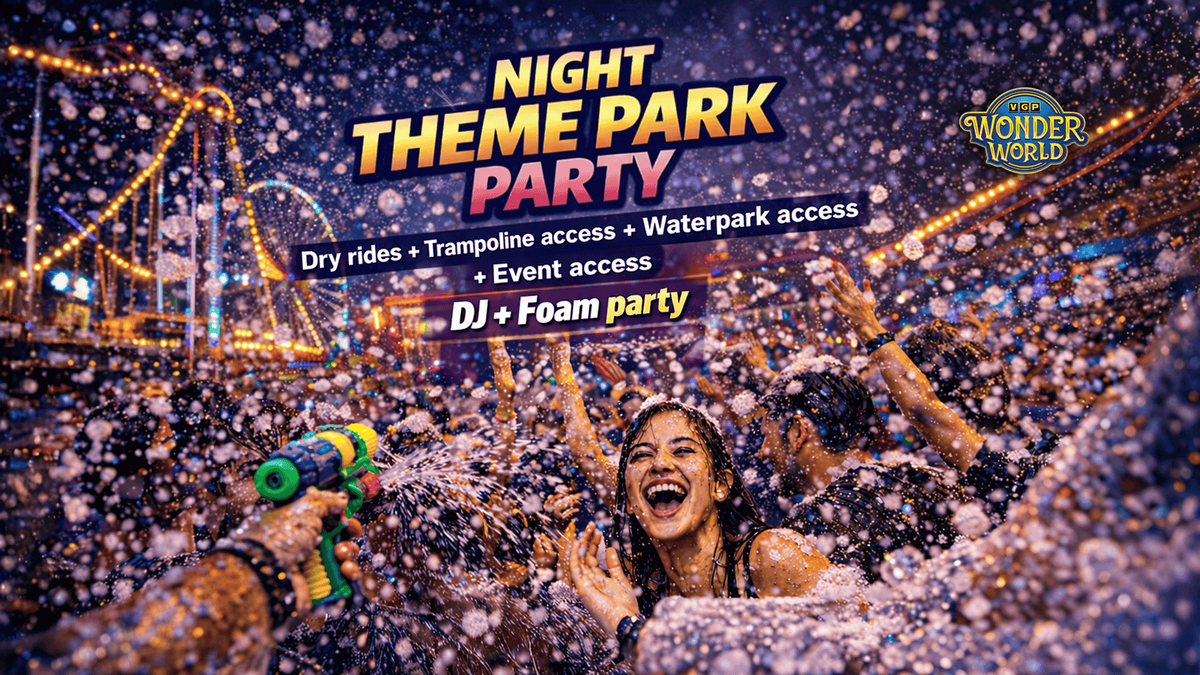 Get ready for a fun-filled night at VGP Wonder World, Chennai, where the theme park comes alive after dark. Enjoy access to exciting dry rides, trampoline zones, and the waterpark, all in one ticket.Dance your heart out at the DJ-led foam party, soak in the vibrant atmosphere, and make the most of a night packed with music, lights, and thrilling experiences. Perfect for friends and groups looking for a lively night out.