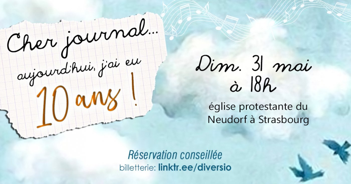 Réservation en ligne : https://www.helloasso.com/associations/ensemble-vocal-diversio/evenements/cher-journal-aujourd-hui-j-ai-10-ans-31-05-strasbourg