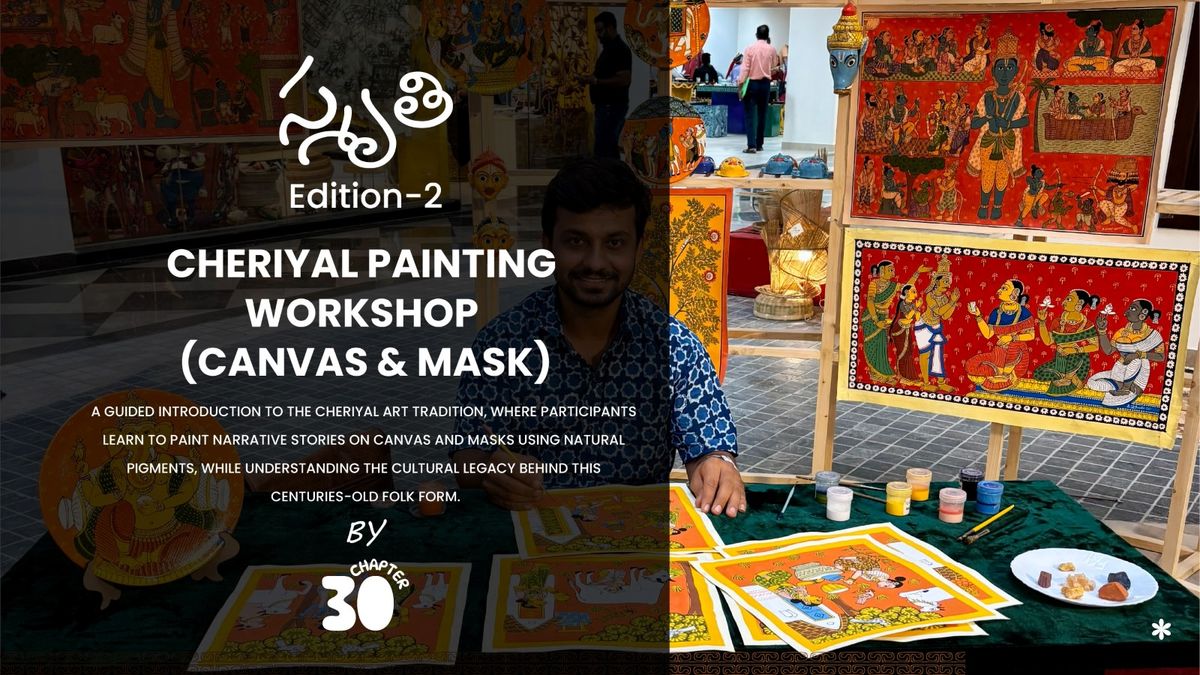 Presented by స్మృతి (Smruthi) – Edition 2Cheriyal painting is a traditional narrative art form practiced by the Nakashi artist community, rooted in the Kakatiya and Vijayanagara periods. Known for its bold lines and storytelling style, it depicts episodes from the Ramayana, Mahabharata, and Indian Puranas.In this workshop, participants will learn the basics of Cheriyal painting using natural pigment colours on khadi cloth and tree gum.You can choose either of the two slots. Time Slot:• Mask Painting: 11:00 AM – 1:00 PM (Create your own Cheriyal mask)• Canvas Painting: 1:30 PM – 3:30 PM (Paint a Cheriyal-inspired canvas to take home)The session is conducted by D. Vinay Nakash, a 36th-generation Nakashi artist continuing a legacy passed down since the 13th century.All materials provided | No prior experience needed