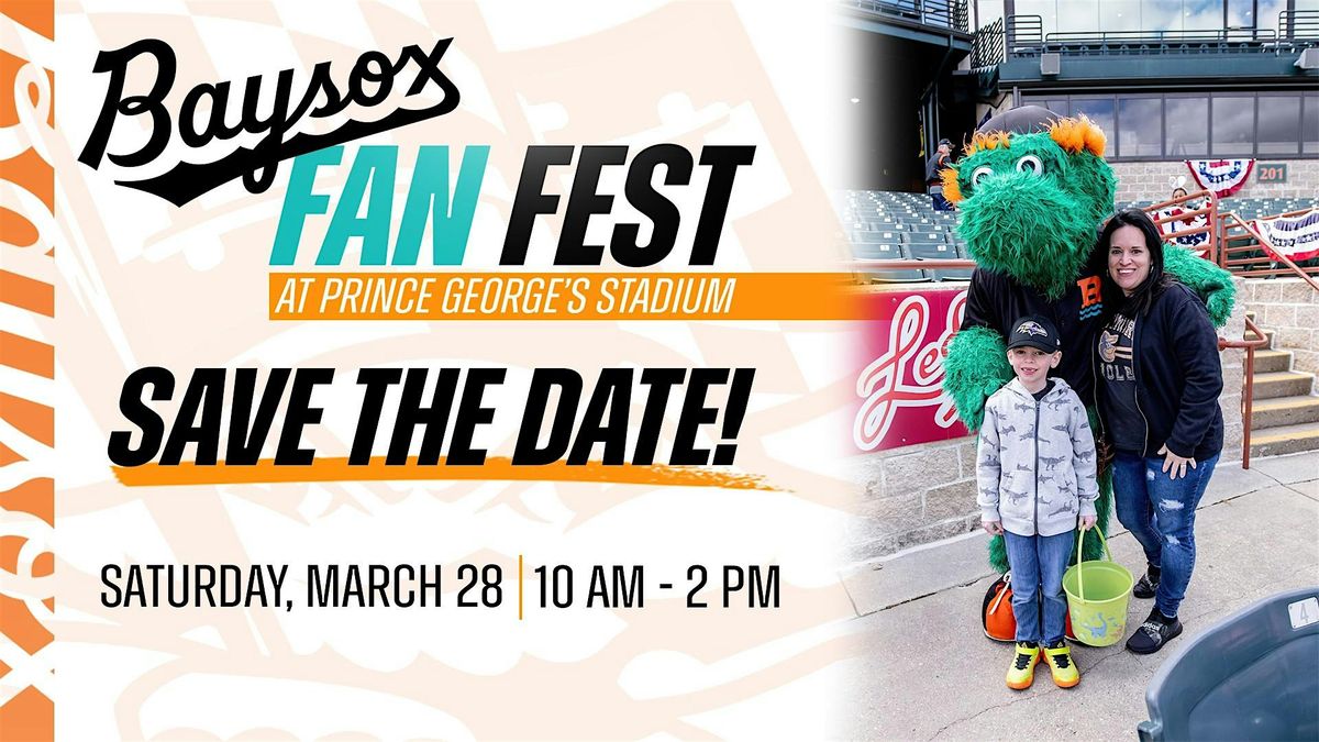 Get ready for a fun day at Prince George's Stadium! Join us on March 28, 2026 at 10:00 AM for the Chesapeake Baysox Fan Fest. Bring the whole family and enjoy exciting activities, interactive games, and plenty of ballpark fun. Meet fellow fans and kick off the season with the Baysox community. Whether you’re a longtime supporter or just looking for a great way to spend your Saturday, this event is for you!