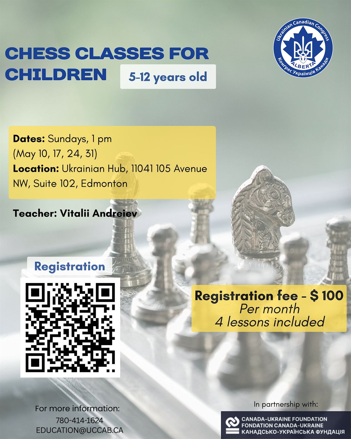Ukrainian Canadian Congress – Alberta Provincial Council (UCC-APC) invites children ages 5–12 to join small-group chess classes at the Ukrainian Hub in Edmonton.