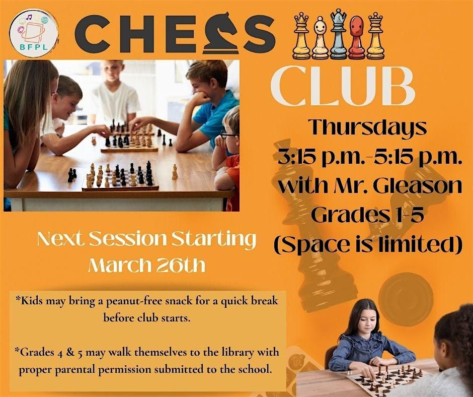 Please be prepared to make at least a 6-week committment to the Chess Club (March 26, April 2, 16, 23, 30 and May 7)
