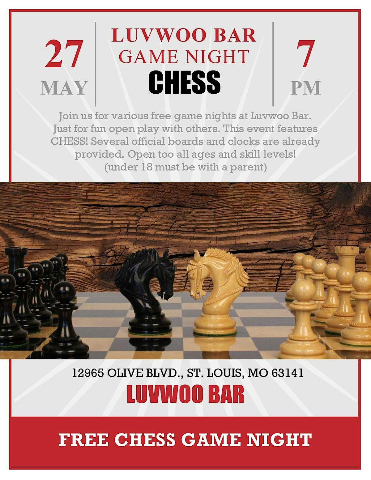 Join us for various free game nights at Luvwoo Bar. Just for fun open play with others. This event features CHESS! Several official boards and clocks are already provided. Open too all ages and skill levels! (under 18 must be with a parent). Free, but please buy something to support the venue.
