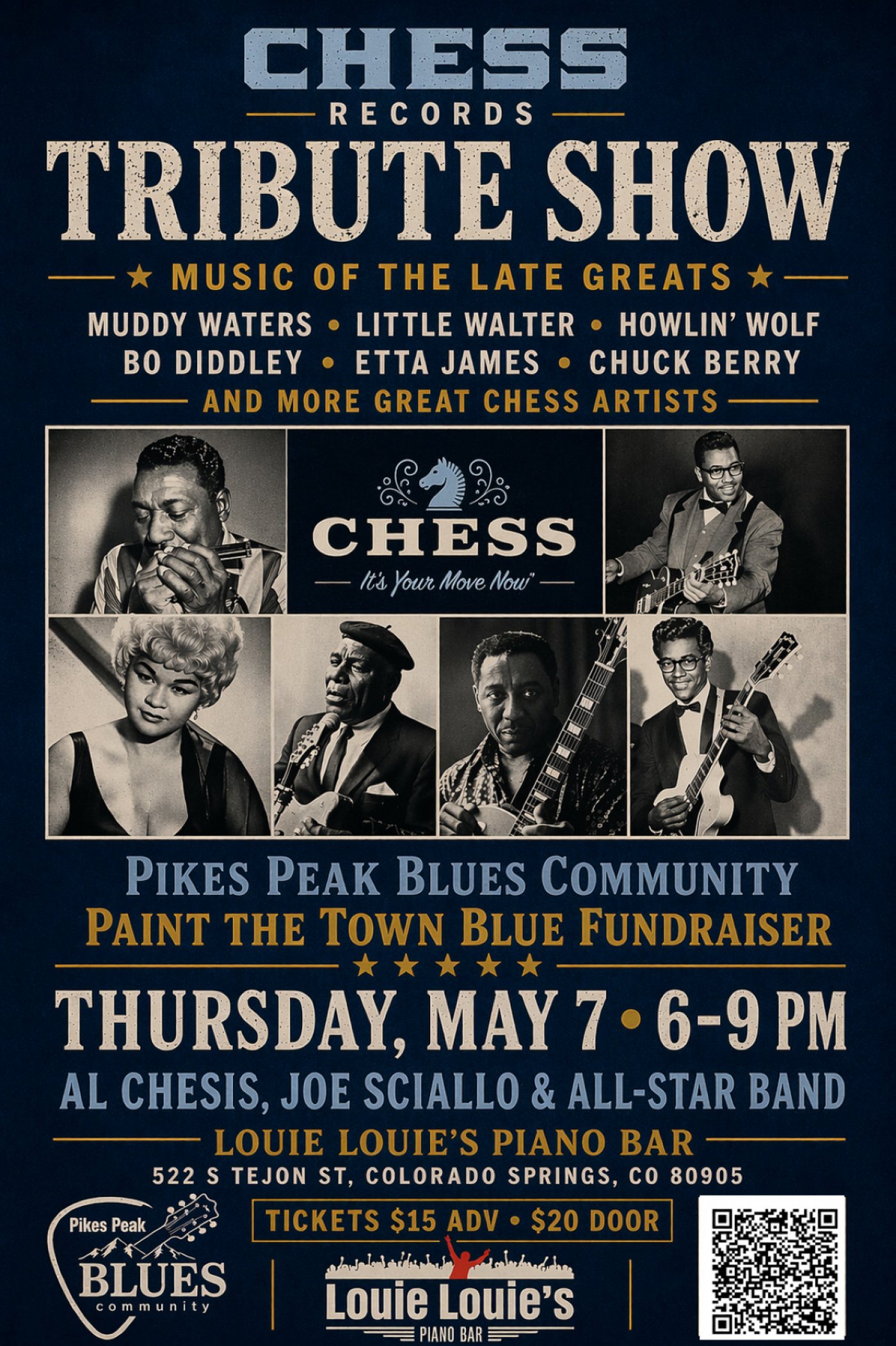 Our Chess Records Tribute Show features an exceptional lineup of local musicians: Al Chesis, Joe Sciallo, Niki Coakley, John Flores, Matt Podschweit, and Kyle “Big Chief” Roberts. This all-star lineup is set to light up the stage at Louie Louie’s Piano Bar (522 S Tejon St) on Thursday, May 7th.